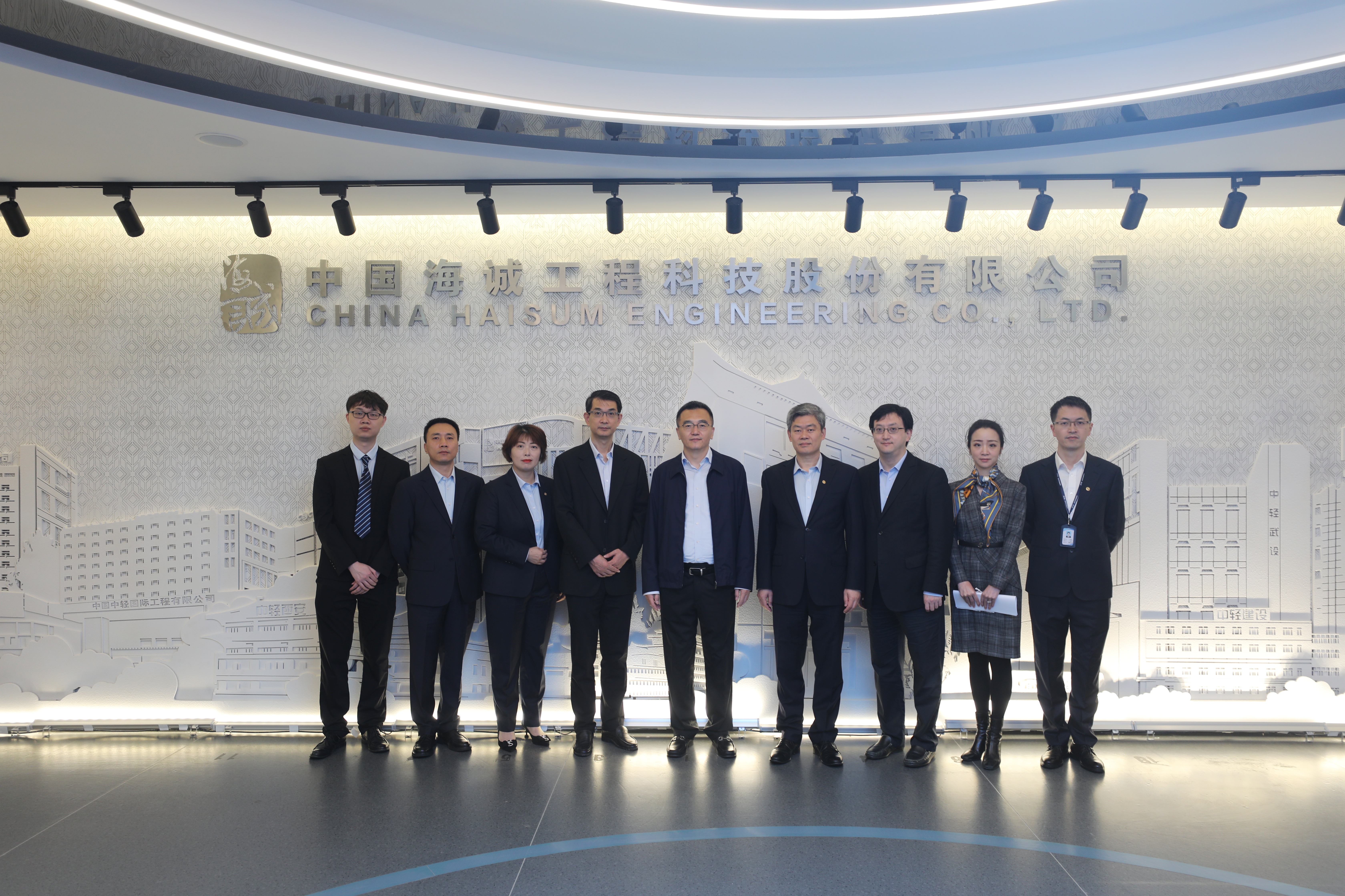 Bao Jianxiang and Hao Xiang, Executive General Managers of Shenwan Hongyuan Financing Services Corporation, Tang Meng, an analyst of construction industry of the Research Institute, Wang Senhao, Director of Board Office of China Haisum, and Pan Zhixiang, General Manager of EIM Digital Innovation Center, attended the work exchange meeting.