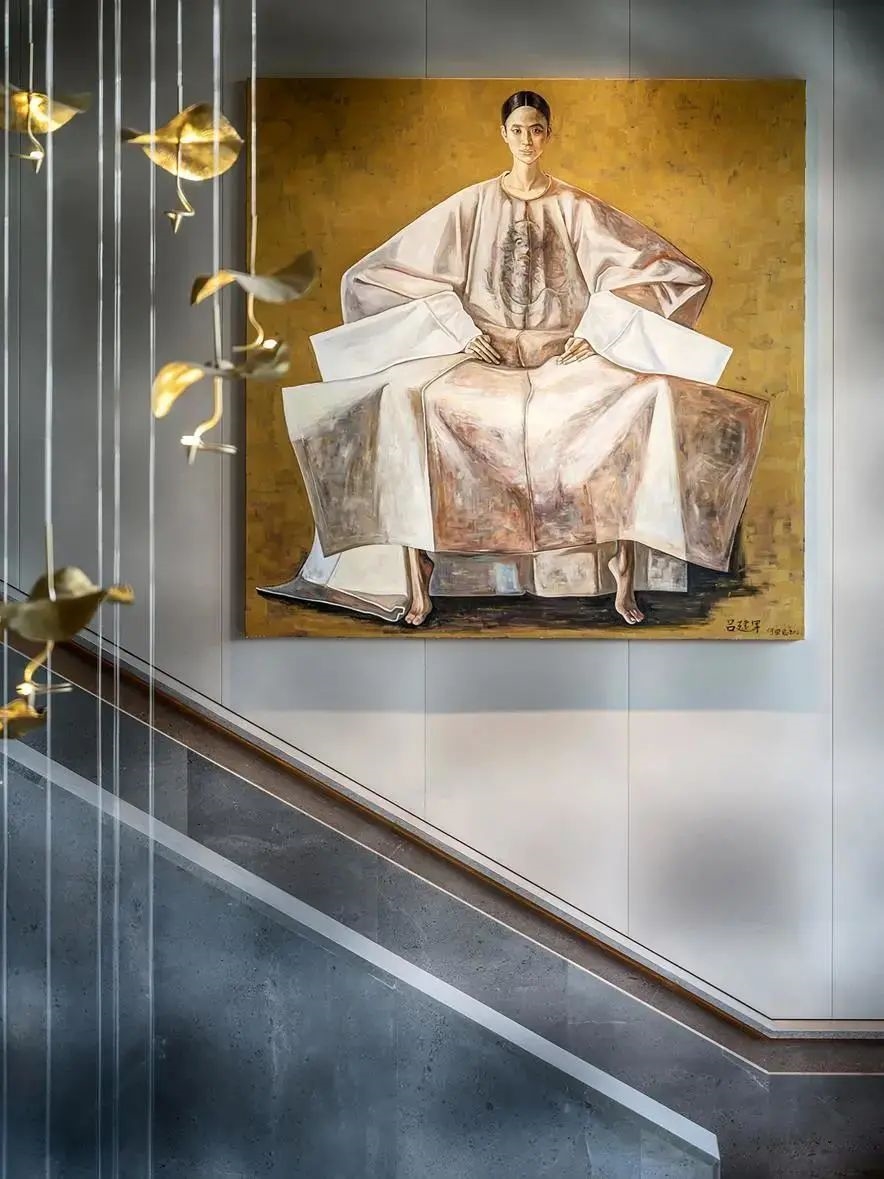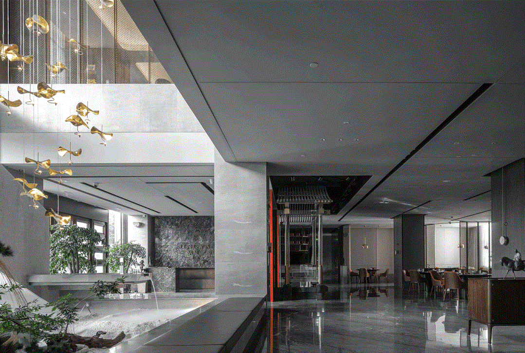 在方案设计之初,设计师希望通过现代设计手法将东方情的世界观融入整体空间内,诠释中国传统智慧与生活美学。大堂背后正对就餐区的区域设计师希望通过中国传统古建斗拱现代手法的表达在此设置一处戏楼,时空穿越,舞台上抚琴歌唱着的仿佛是从五代时期韩熙载夜宴上走出的曼妙女子,她轻轻吟唱着传世今生,在京宴一一上演。