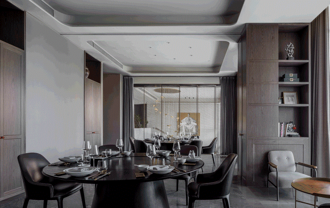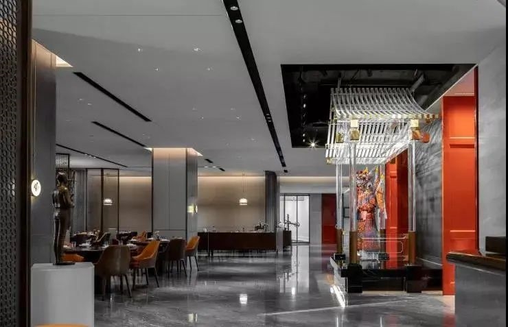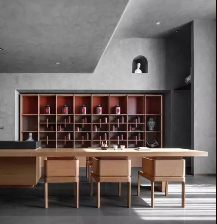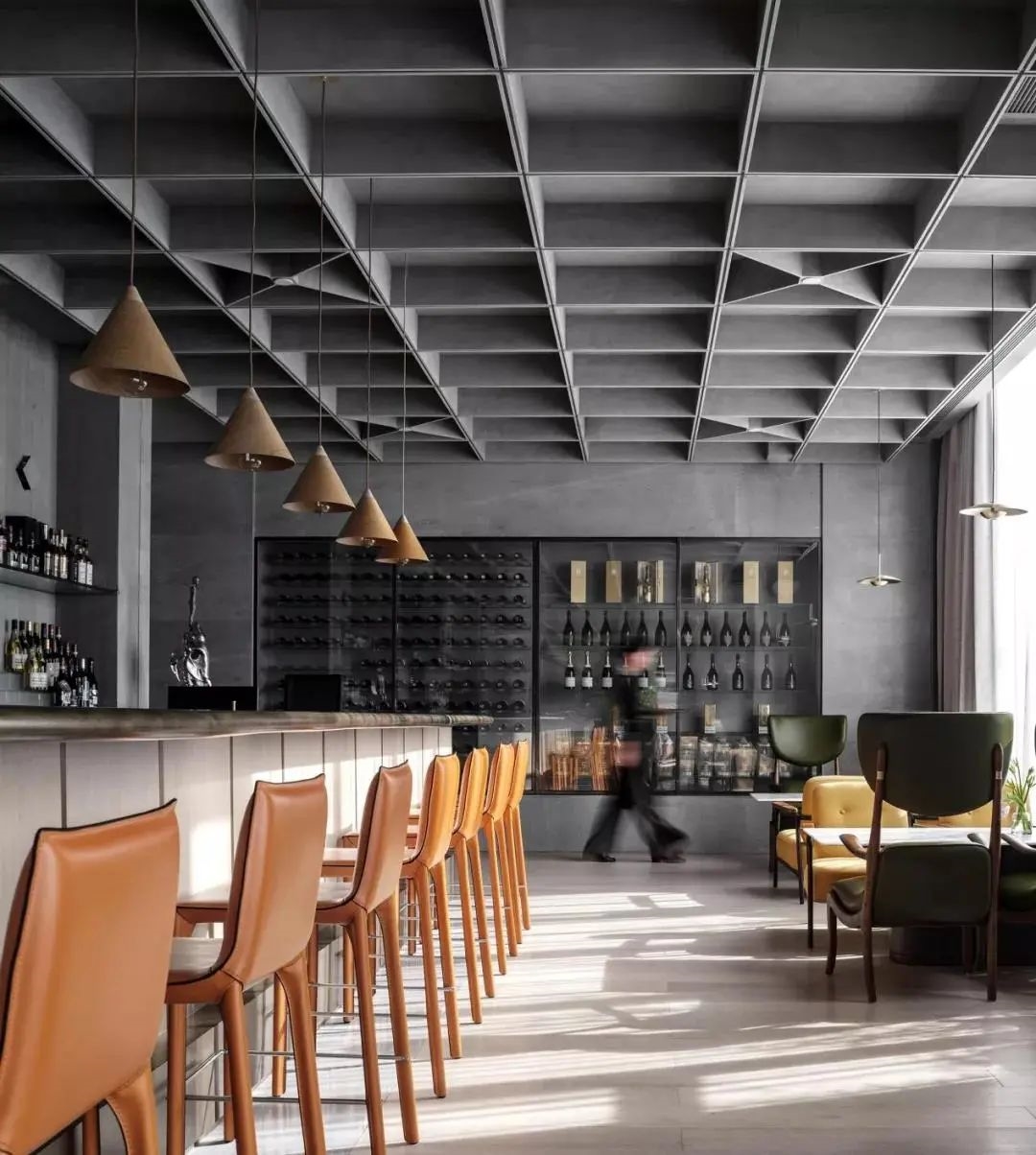 进餐之后意犹未尽来到茶室与酒吧区,一改传统古典的韵味,设计师将现代设计手法在空间中表现的淋漓尽致,大面积高级水泥灰色在空间中铺开,原木家具的搭配为来此的客人以温馨之感,贯穿整个餐厅的京红色点缀于此,呼应主题展现惊艳之处。