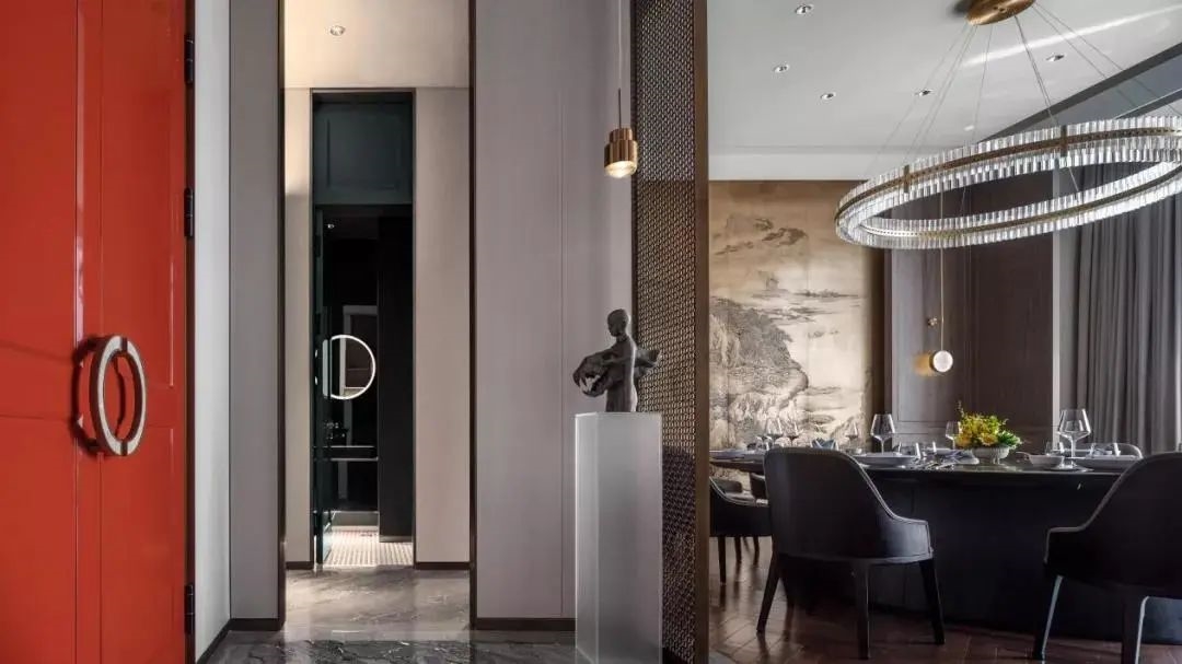 一步一景,一眼一画,随着动线从大堂进入主餐厅,中国红在餐厅晕染开来,点缀镶嵌于门上,挂画间,饰品处,在整体暖高级灰的主色调下铺以纯正的京红反而映衬出闹中取静的东方之魂。