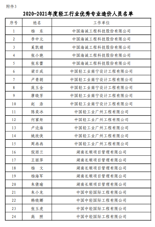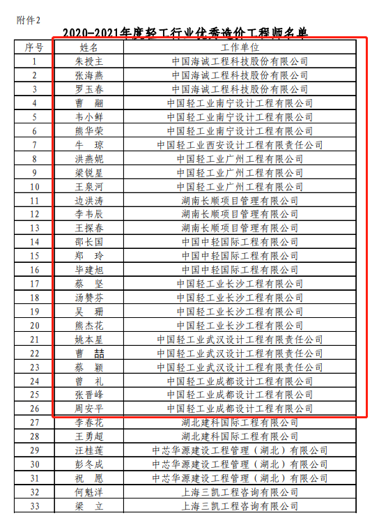 日前,中国轻工业工程建设协会公布了“2020-2021年度轻工行业优秀造价咨询企业和优秀造价工程师(专业)评价结果”,best365英国在线体育及所属广州公司、武汉公司、南宁公司、成都公司、西安公司、北京公司、湖南长顺均荣膺“轻工行业优秀工程造价咨询企业”称号,同时公司26名员工被评为“优秀造价工程师(共33名)”,40名员工被评为“优秀专业造价人员(共45名)”。