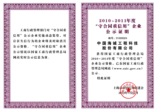 年度全国“守合同重信用”企业评选中,获评全国“守合同重信用”企业。