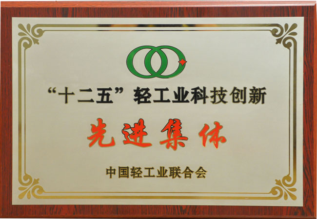 近日,我公司被中国轻工业联合会授予“‘十二五’轻工业科技创新先进集体”荣誉称号。