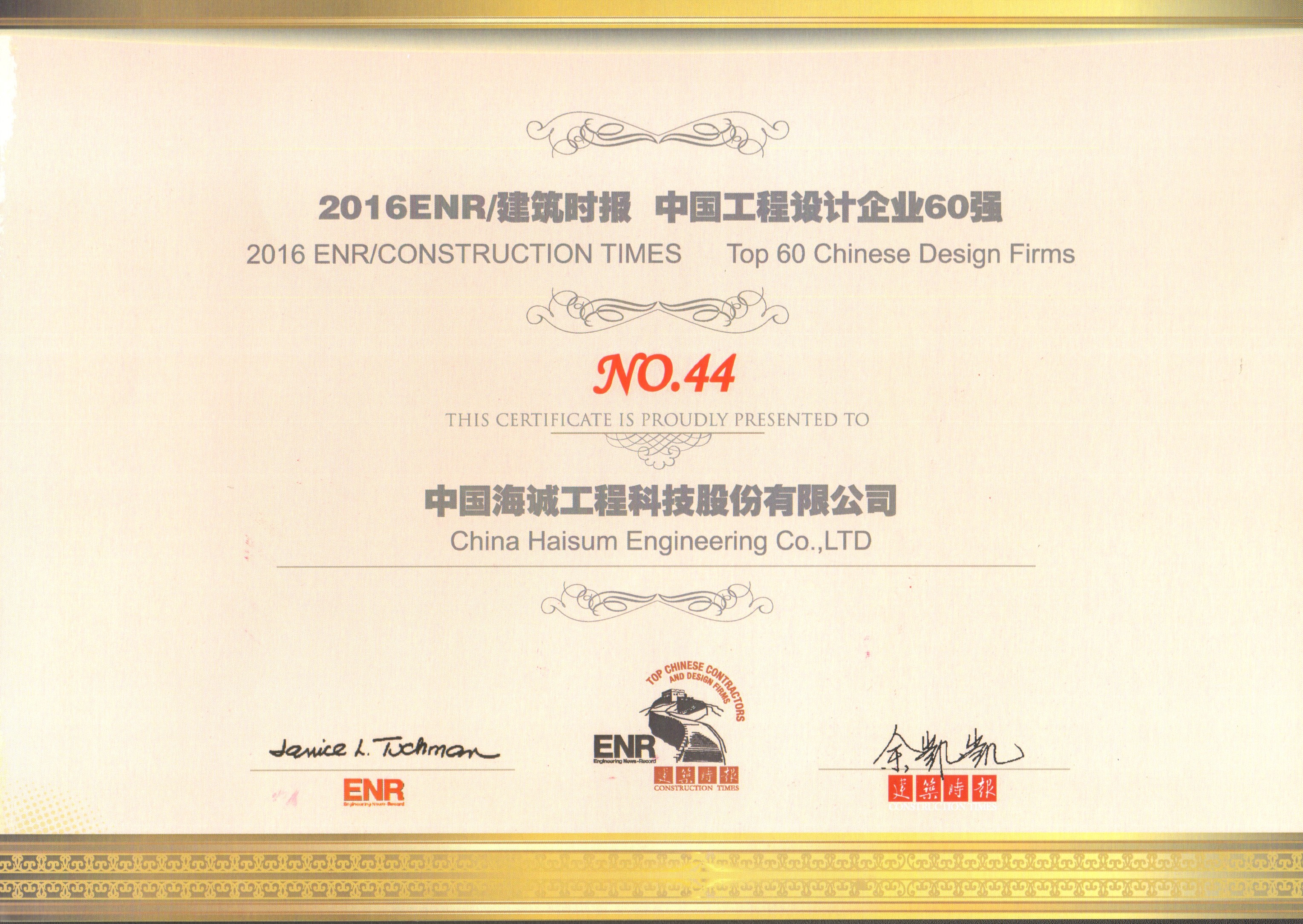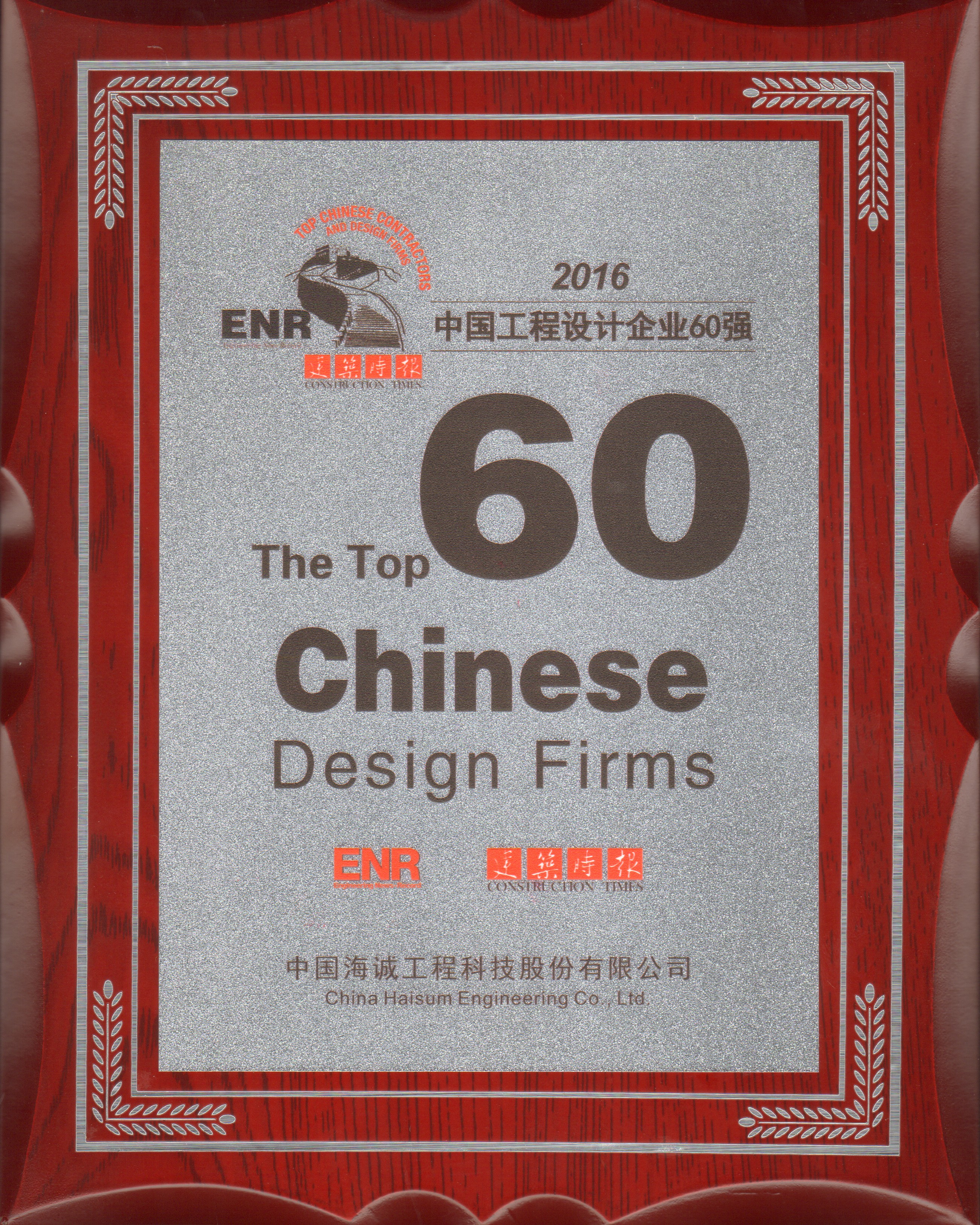 2016年ENR/《建筑时报》“中国承包商80强和工程设计企业60强”颁奖典礼于2016年11月24日-25日在福州隆重举行。海诚股份以设计营业收入103931.84万元位列中国工程设计企业60强第44位。