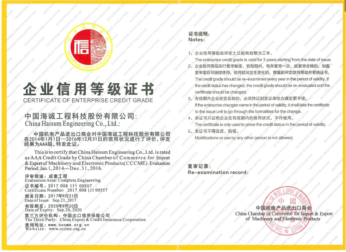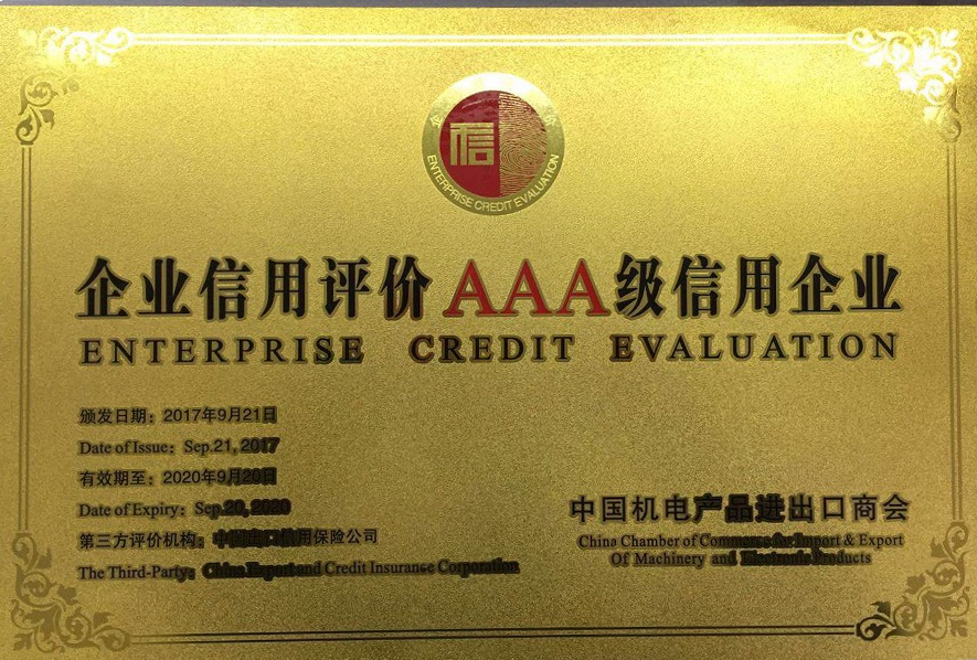 近日,中国机电产品进出口商会公布了2017年机电行业信用评价企业名录,我司再次荣获“成套工程领域AAA级(最高级别)信用企业称号”。