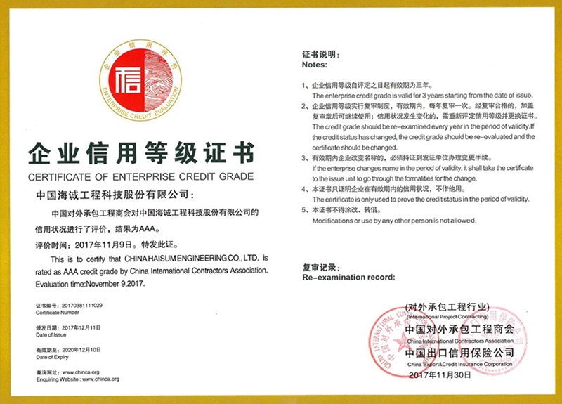 近日,在中国对外承包工程商会和中国出口信用保险公司联合举办的2017年度对外承包工程企业信用等级评价中,公司又一次获得“aaa级信用企业”称号。