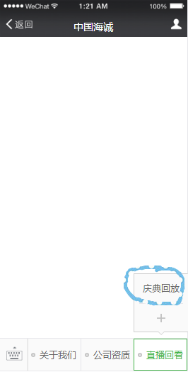 2、点击自定义菜单“直播回看”—“庆典回放”按钮进入直播页面。