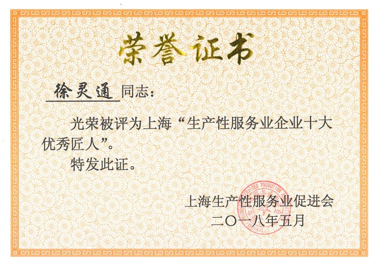 5月8日下午,上海生产性服务业促进会召开二届二次会员大会,会上授牌表彰了“上海十佳生产性服务业功能区示范园区”、“上海生产性服务业企业十大优秀匠人”、“上海生产性服务业企业十大先进匠人”。我公司结构专业总监徐灵通被授予“上海生产性服务业企业十大优秀匠人”称号。