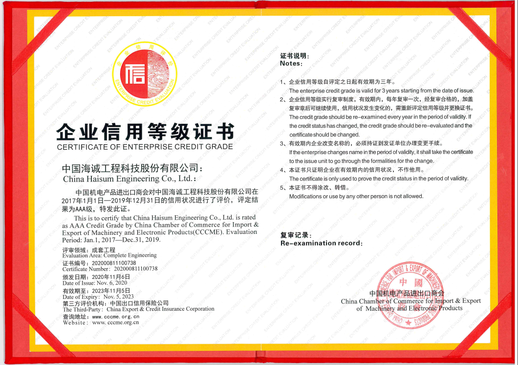 中国机电产品进出口商会作为我国机电产品进出口行业唯一的全国性商会,现有会员企业近万家,具有较强的行业代表性。企业信用等级评价由商务部、国资委牵头,中国出口信用保险公司作为第三方评审机构,中国机电产品进出口商会进行复审。公司自2008年起参加中国机电产品进出口商会企业信用等级评价以来,已连续多年获得AAA级信用企业称号。获得该荣誉,代表公司在成套工程领域有极高的信用管理水平,为公司更好地“走出去”参与国际合作与竞争发挥信用支撑作用。