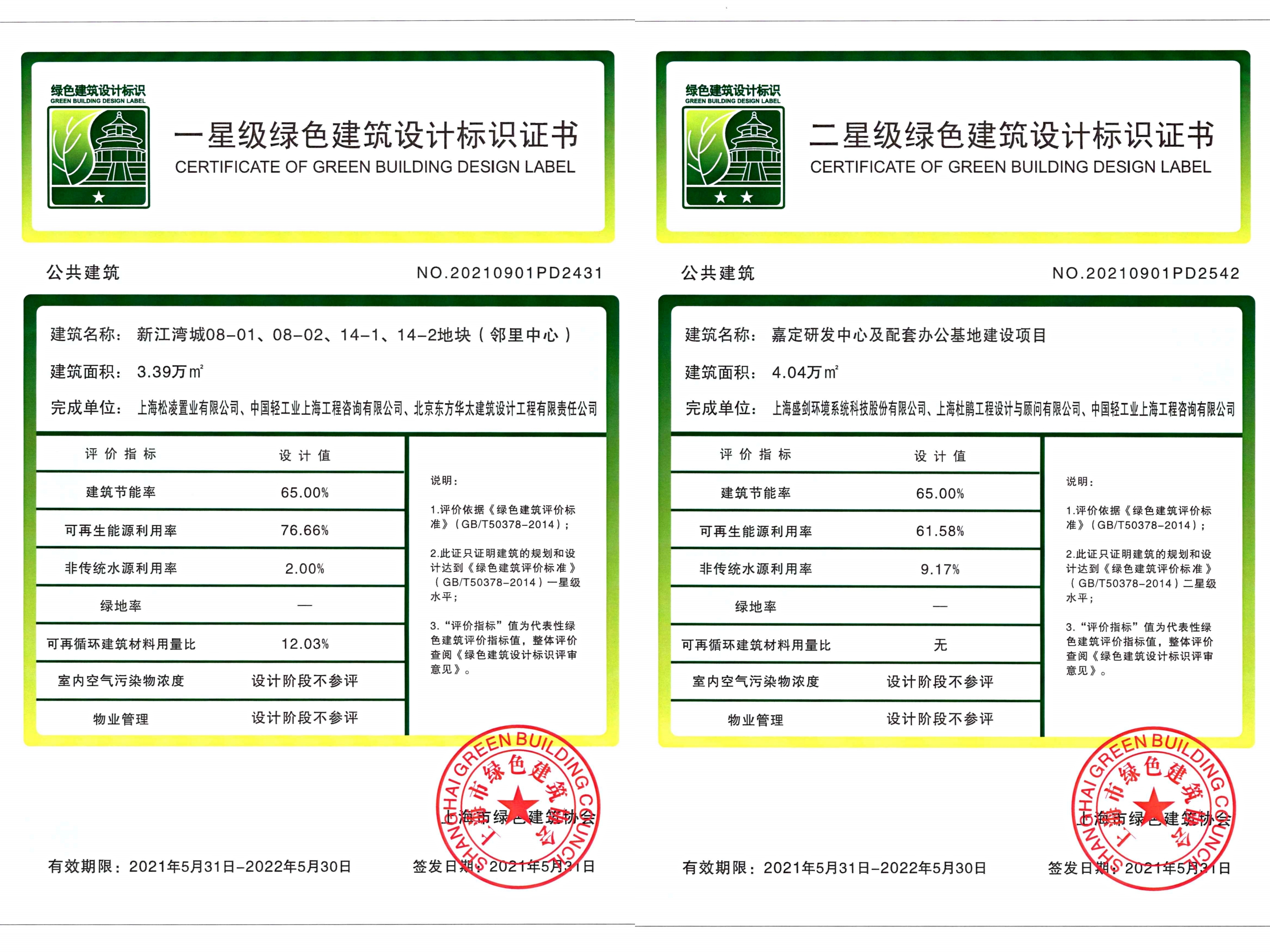 近日,海诚股份所属中国轻工业上海工程咨询有限公司担任绿建咨询顾问的“嘉定研发中心及配套办公基地建设项目”以及“新江湾城08-01、08-02、14-1、14-2地块(邻里中心)项目”分别获得上海市绿色建筑协会认证二星级、一星级绿色建筑设计标识证书。
