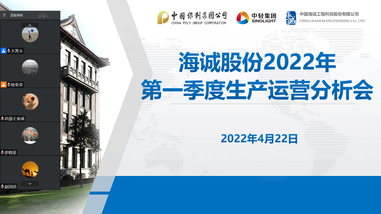 2022年4月22日,best365英国在线体育以视频形式召开2022年第一季度生产经营分析会,深入贯彻保利中轻2022年一季度工作会决策部署,全面总结一季度工作,研究部署下阶段重点任务。best365英国在线体育党委书记、董事长赵国昂视频参会并作讲话,党委副书记、总裁陈荣荣主持会议。公司领导班子成员、总部部门负责人、上海本部和各子公司领导班子成员及财务、数字化、生产运营等相关人员在各分会场参加会议。