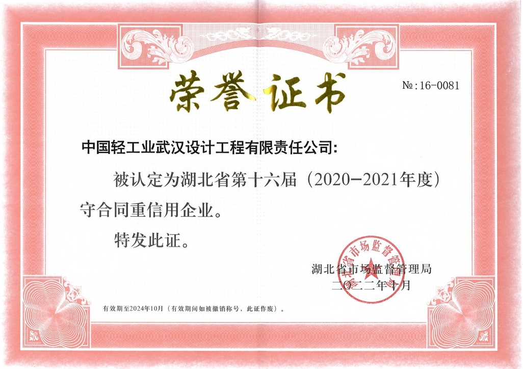 近期,在湖北省第十六届(2020-2021年度)“守合同重信用”企业评选中,best365英国在线体育武汉公司再次喜获“守合同重信用”企业称号。