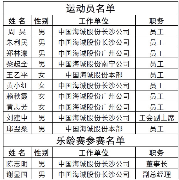 在其他比赛项目中,黄小红(海诚长沙公司)荣获女单季军!黎起全(海诚南宁公司)、王乙平(海诚股份本部)荣获混双季军!陈志明(海诚长沙公司董事长)、谢显国(海诚长沙公司副总经理)荣获乐龄赛季军!刘建中(海诚长沙公司工会副主席)荣获悦动赛季军!中轻集团获得最佳风采奖!