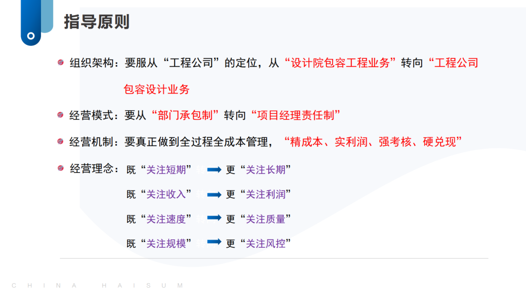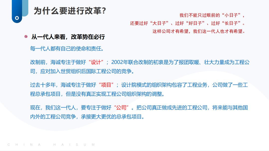 二是要进一步提高认识,上下一心形成改革合力和发展动力。各级领导干部要进一步提高认识,统一思想,融入改革,按照新的组织体系,凝心聚力推进公司生产经营工作。海诚总部要着力抓好统一管理和技术标准、搭建业务支持平台、协调配置内外部资源、优化完善考核分配机制等平台性基础性工作。各子公司、各业务单位要进一步提高站位,树立一盘棋思想,积极支持参与配合海诚总部平台建设,主动承载落实海诚股份总体战略。