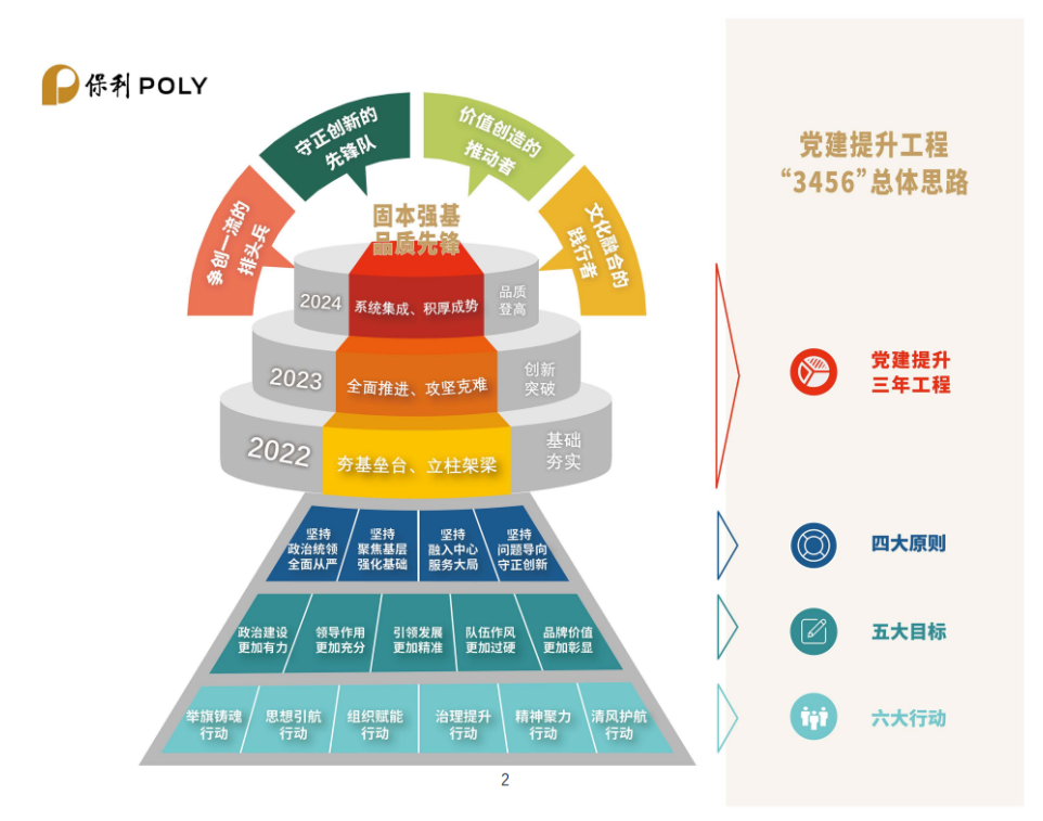 编者按:12月22日,保利集团在京召开学习贯彻党的十九届六中全会精神暨2022年度党建工作会,会上正式发布了《保利集团“固本强基、品质先锋”党建提升工程三年(2022-2024年)行动方案》(以下简称“《方案》”)。为贯彻落实《方案》,保利中轻迅速组织传达学习,并特别策划《党建提升 保利中轻在行动》专题,计划持续定期报道保利中轻贯彻落实情况,旨在带领全体干部员工一同认真学习、深刻领会,切实落实《方案》要求,突出抓基层强基础,推动党建工作提质增效、迈上新台阶,以高质量党建引领保障保利中轻高质量发展,为保利集团建设世界一流,追求卓越,贡献中轻力量。今天第一期,一起来学《方案》的主要内容。