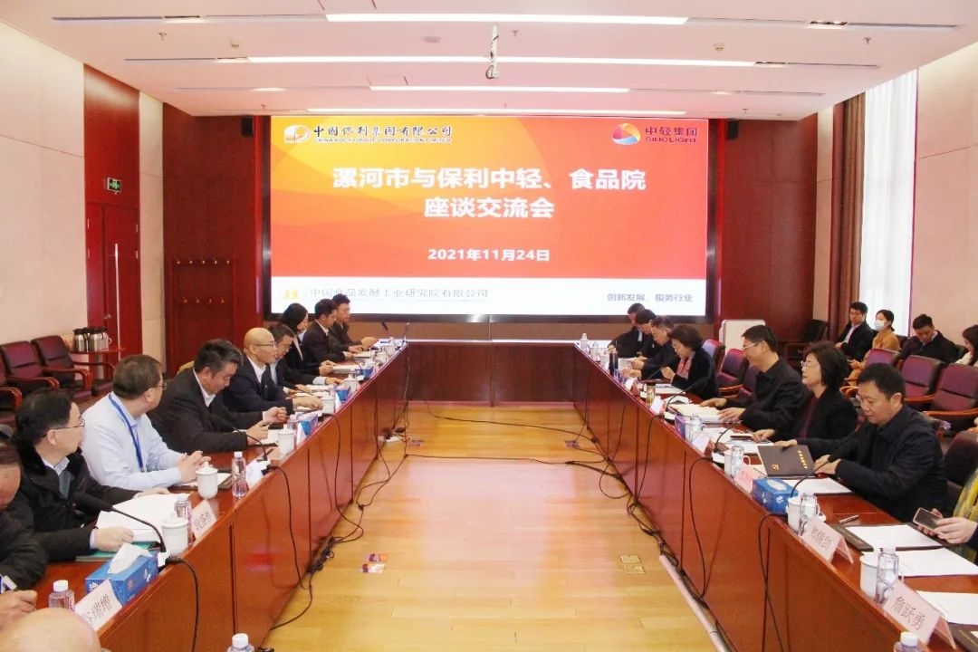2021年11月24日上午,中国保利集团有限公司(以下简称“保利集团”)党委常委、副总经理,中国轻工集团有限公司(以下简称“保利中轻”)党委书记、董事长张万顺,保利中轻纪委书记童云翔、副总经理蔡木易在中国食品发酵工业研究院有限公司(以下简称“中国食品研究院”)会见河南省漯河市市委书记刘尚进、市政协主席吕岩、市委常委、宣传部部长、市政府副市长常英敏一行,双方就推动未来合作进行交流探讨。