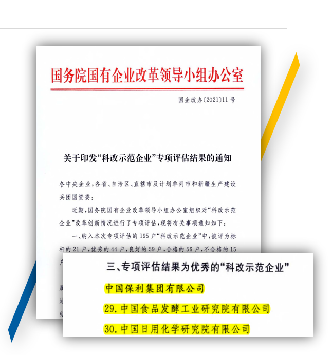 早在2020年4月,中国食品发酵工业研究院和中国日用化学工业研究院便入选 “科改示范企业”名单。两家企业围绕科技创新和市场化改革两个维度,不断增强“科改示范企业”的发展动力、潜力、活力,全面释放改革红利,在2021年“科改示范企业”改革创新专项评估中均被国务院国资委评为优秀。