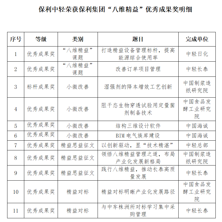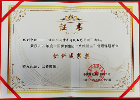会议期间,举行了“八维精益”优秀成果颁奖典礼。保利集团从2022年“八维精益”各项工作成果中评选出83项优秀成果奖,其中标杆成果奖6项。保利中轻荣获标杆成果奖1项、优秀成果奖10项,其中,“湿强剂的降本增效工艺创新”课题获得标杆成果奖。该课题团队通过不断优化湿强剂生产技术方案,成功研制出低成本高质量生产技术,提升了产品市场份额和竞争力,实现客户成本降低15%。