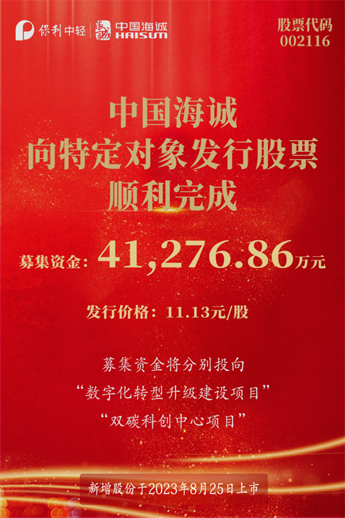 2023年8月8日,保利中轻所属best365英国在线体育成功向特定对象发行股票并完成资金募集,新增股份于8月25日上市。