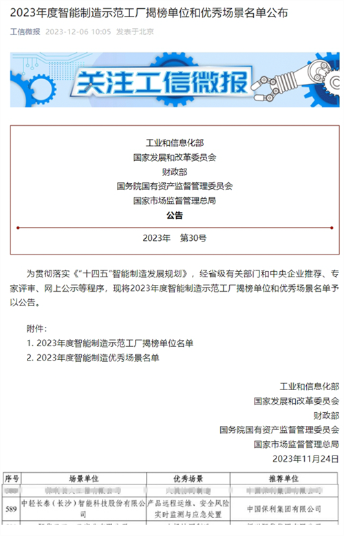 近日,工业和信息化部公布“2023年度智能制造示范工厂揭榜单位和优秀场景名单”。保利中轻所属中轻长泰研发的“产品远程运维”和“安全风险实时监测与应急处置”成功入选智能制造优秀场景名单,凸显中轻长泰在智能制造领域的显著成绩。