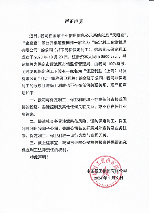 近日,我司在国家企业信用信息公示系统以及“天眼查”、“企查查”等公开渠道查询到一家名为“保定利工企业管理有限公司”的公司(以下简称保定利工)。信息显示保定利工成立于2023年10月23日,注册资本人民币8500万元,登记机关为保定市莲池区市场监督管理局,由我司100%持股。同时发现保定利工下设有一家名为“保卫利胜(上海)能源有限公司”(以下简称保卫利胜)的全资子公司。我司非保定利工的股东且与保卫利胜也不存在任何关联关系,现严正声明如下: