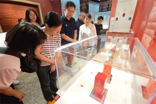参观中,大家认真聆听讲解,仔细观摩展品。一枚枚精美别致的印章,将新材料与篆刻文化完美融合,玻璃微珠、先进陶瓷、复合材料、特种水泥、碲化镉发电玻璃等新材料印章让人应接不暇,生动展现了北京老城永定门到钟鼓楼15个核心遗产景观、建筑布局和历史文化价值。在感受大众篆刻艺术无穷魅力的同时,仿佛置身于北京中轴线气势恢宏、秩序井然的城市建筑群中,深刻感受北京中轴线作为城市文化脊梁的重要意义。