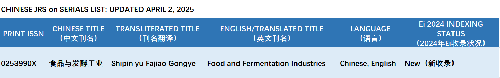 《工程索引》(EI Compendex)是全球三大权威学术数据库之一,由美国工程信息公司于1884年创办,以严苛的遴选标准和全球覆盖性著称。目前该数据库已收录期刊4427种,在食品科学这一选择性收录学科中,全球仅有79种食品科学类期刊被收录,包括《食品与发酵工业》在内。