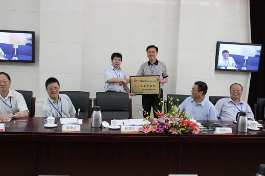 (陈鄂生董事长向海诚股份公司总裁严晓俭授先进党组织荣誉牌匾)