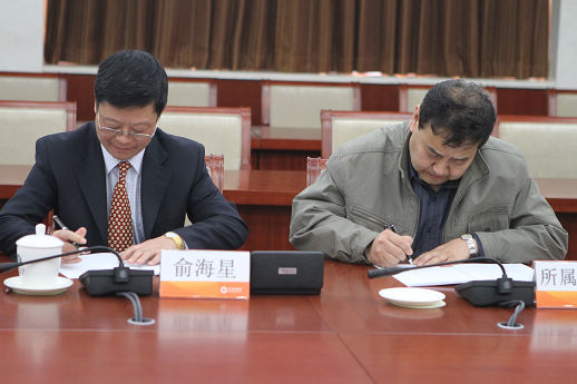 集团公司总经理俞海星与日化院院长王万绪签订任务合同书