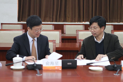 集团公司总经理俞海星与皮革院院长杨承杰签订任务合同书