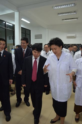 揭牌仪式后,陈鄂生董事长陪同刘延东国务委员与梅森安副首相参观了建设中实验室。刘延东详细地询问了设备功能,要求严格控制援助设备的质量,详细论证援助方案,使援助项目切实满足柬方实际需求。陈董事长感谢刘延东国务委员对中轻集团的关心和支持,表示一定落实指示精神,建设好援助项目。