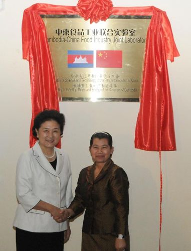 2012年12月7日,国务委员刘延东与柬埔寨王国副首相梅森安在柬埔寨首都金边共同为“中柬食品工业联合实验室”揭牌。教育部部长袁贵仁、科技部党组书记王志刚、国务院副秘书长江小涓、外交部副部长宋涛及柬埔寨国务委员会、工业矿产及能源部、教育部、外交部等部门高级官员出席揭牌仪式。集团公司陈鄂生董事长出席仪式并陪同两国领导人参观了实验室。集团公司所属中国食品发酵工业研究院院长蔡木易、best365英国在线体育股份南宁公司董事长王毅军等中柬双方项目执行人员参加了典礼。