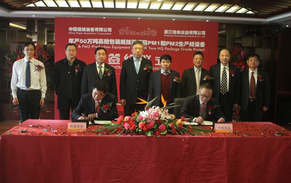 随后,中国造纸装备有限公司总经理周后炼先生和浙江永泰纸业集团生产总监、浙江传承实业有限公司董事陈献忠先生代表合作双方在合同文本上签字。