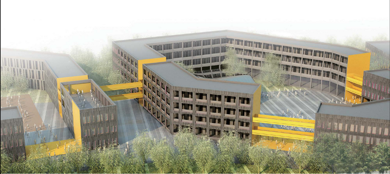 总用地面积28565.9平方米,总建筑面积14223.2平方米。本工程共包含教学楼、阶梯教室、餐厅、体育馆、变电所及门卫等六个单体。