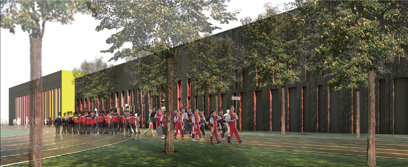 教学楼为局部四层,层高3.9m,建筑高度16.86m。阶梯教室为单层建筑,局部设置夹层,建筑高度为8.150m。餐厅为二层建筑,层高5m,建筑高度为11.050m。体育馆为单层建筑,局部设置夹层,建筑高度为11.015m。立面设计采用GRC挂板、玻璃及木材,力图通过精致的细节设计,创造出精美的品质。