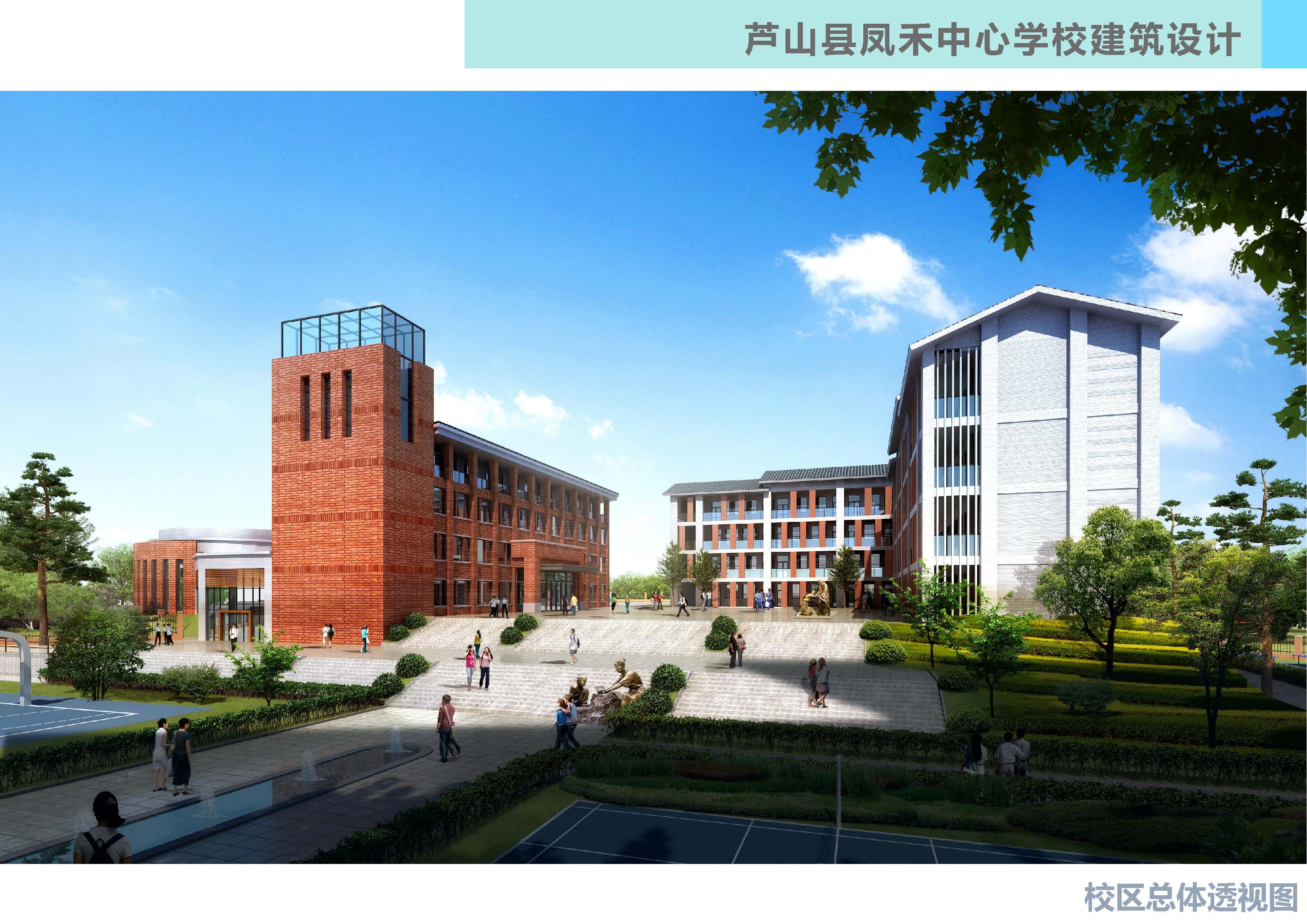 芦山县凤禾中心校的灾后重建工程,本工程的援建方为蓝光集团,改建后学校将更名为芦山蓝光中心校。本次改建工程主要包括,新建综合楼2500平方米,改建运动场地及学校广场约14000平方米,改建原有教学楼、食堂、宿舍楼等外立面约6200平方米