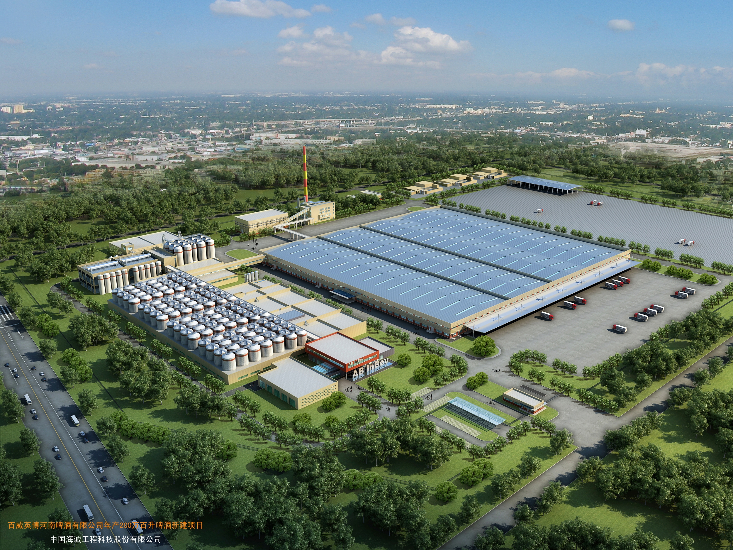 年产啤酒200万百升。包括:原料处理、糖化车间、发酵车间、啤酒后处理车间、包装车间、空瓶堆场、公用动力中心、锅炉房、办公楼等